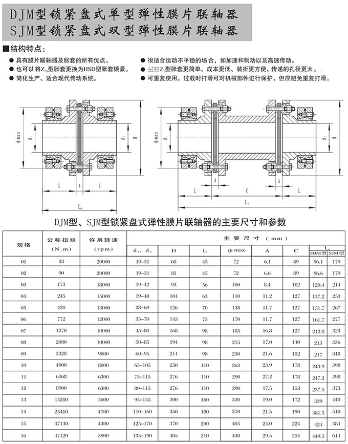 瑞安市寶德隆機械配件有限公司提供DJM型鎖緊盤式單型彈性膜片聯(lián)軸器SJM型鎖緊盤式雙型彈性膜片聯(lián)軸器具有拆裝方便,快速安裝等特點,廣泛用于連接/固定輪轂孔和零件的軸,例如齒輪,錐齒輪,鏈輪,葉輪,凸輪,皮帶輪和飛輪等軸的聯(lián)結固定,咨詢電話:18906872378